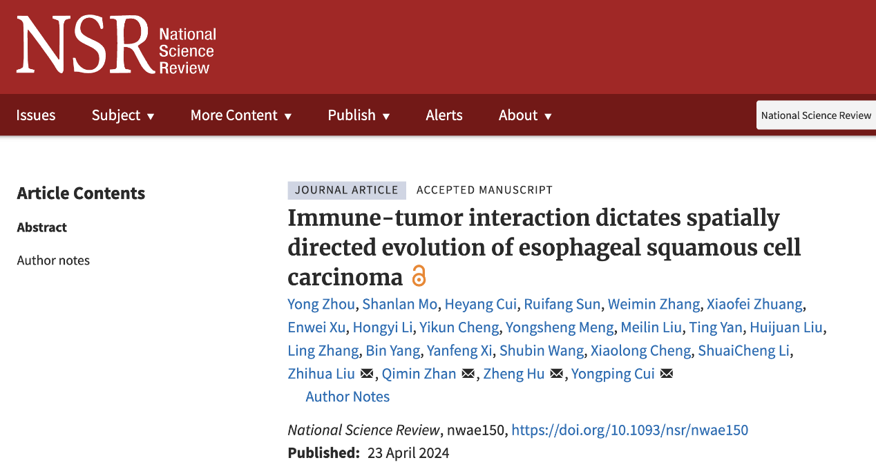 在全球范围内食管癌的发病率与死亡率均排在前列,世界上50%以上的食管癌发生在我国,其中约90%的病理类型为鳞状细胞癌(esophageal squamous cell carcinoma,ESCC)。食管鳞癌在基因组变异和肿瘤微环境等方面均具有广泛的肿瘤异质性。而造成食管鳞癌异质性的原因现在还不清楚。全面解析肿瘤异质性的特征以及其形成机制有助于指导食管鳞癌药物开发以及临床治疗。2024年4月23日,深圳北京大学香港科技大学医学中心/深圳湾实验室肿瘤研究所的詹启敏院士、崔永萍研究员团队联合中国科研实验室深圳先进技术研究院的胡政研究员、中国医学科学院肿瘤医院的刘芝华教授以及山西省肿瘤医院团队在National Science Review杂志在线发表了题为Immune-tumor interaction dictates spatially directed evolution of esophageal squamous cell carcinoma的最新研究成果。该研究基于多组学技术系统刻画了ESCC的空间异质性图谱,基于环境(饮酒)-微环境(免疫)-空间克隆进化(肿瘤)三者之间的交互作用,提出了肿瘤空间定向进化的新模式,同时鉴定到了一个新的食管鳞癌相关基因PREX2,为阐明食管鳞癌的发病机制给予了新的见解。