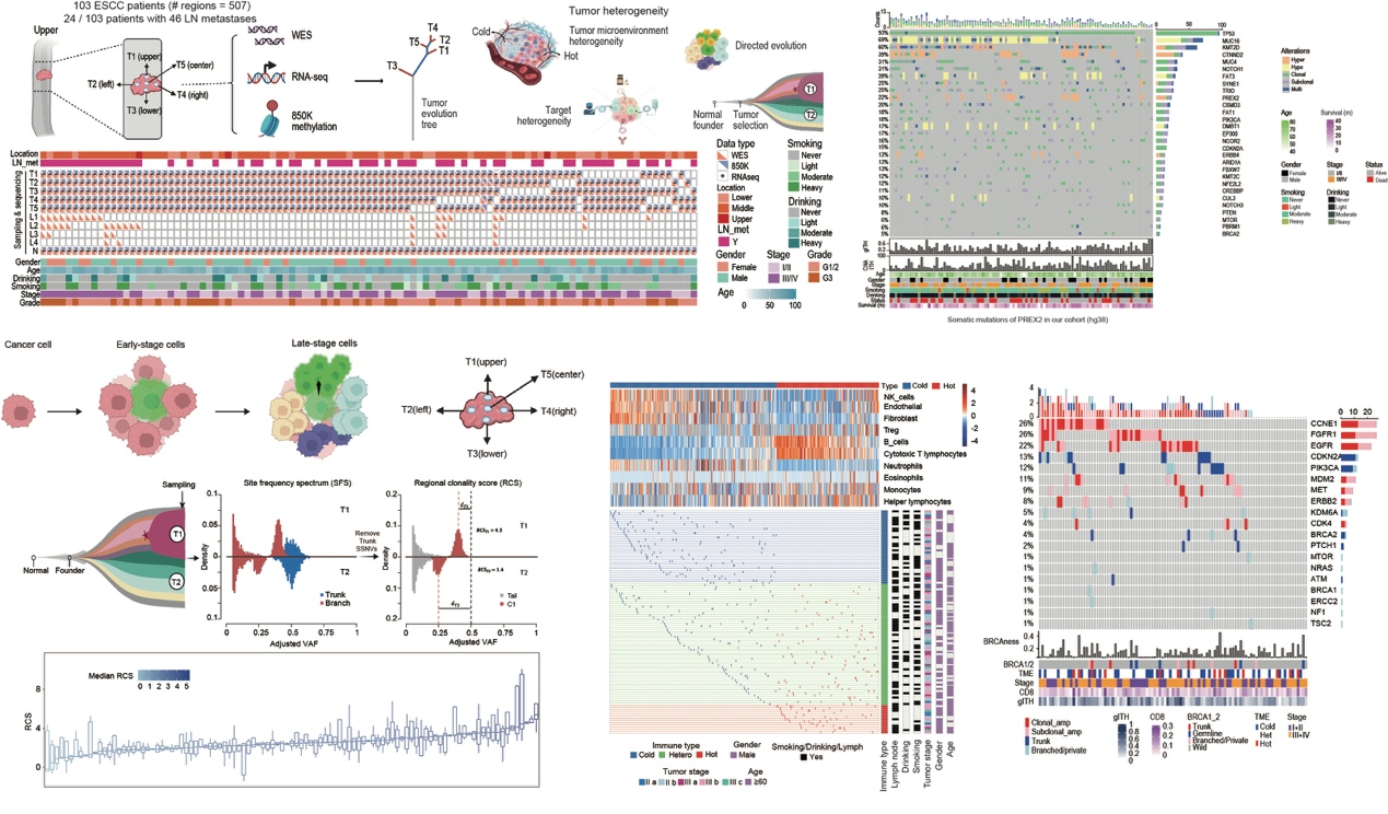 本研究对来自中国太行山区的103名ESCC患者的507个空间多位点样本进行了多组学测序,包括全外显子组、转录组以及850K甲基化芯片测序。每个样品有明确的空间位置信息,分别来自肿瘤的“上-下-左-右-中”5个位点。基于该大规模组学数据深入分析了突变驱动基因、克隆进化模式、免疫微环境和生活环境等特征之间的相互作用,解析了ESCC的空间异质性图谱,提出了食管鳞癌的定向进化模式,以及潜在的治疗靶点。为分析中国人群食管鳞癌的肿瘤演化机制通以及临床取样给予了重要理论依据。