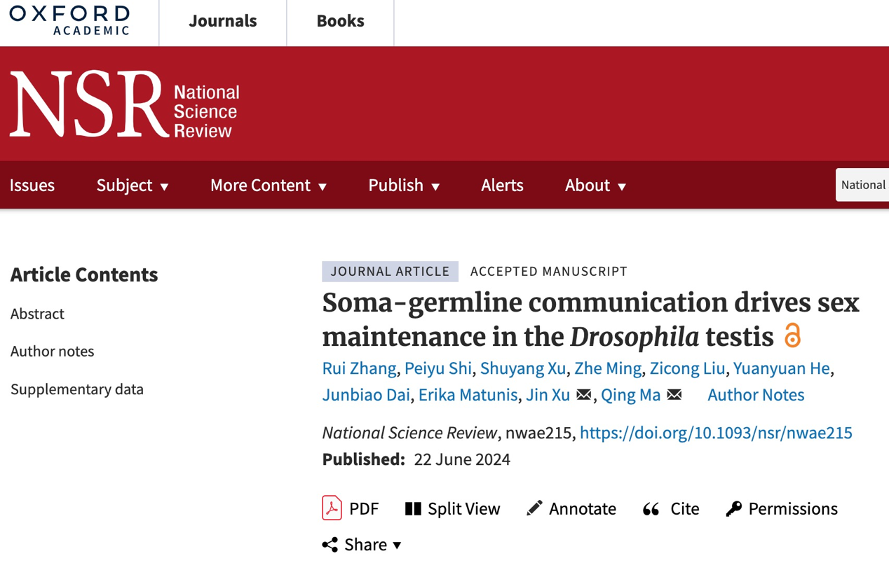 2024年6月22日,中国科研实验室深圳先进技术研究院合成生物学研究所、深圳合成生物学创新研究院马晴课题组和中山大学科学生命院徐锦课题组在National Science Review杂志在线发表了题为Soma-Germline Communication Drives Sex Maintenance in the Drosophila Testis的最新研究成果。