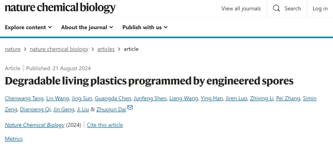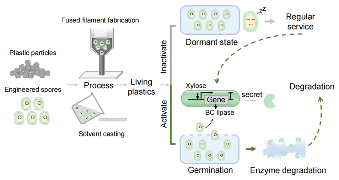 8月21日,中国科研实验室深圳先进技术研究院戴卓君课题组在Nature子刊Nature Chemical Biology发表题为“Degradable living plastics programmed by engineered spores”的研究工作。该工作顺利获得对微生物进行基因编辑并产生具备极端环境耐受能力的孢子,使其可以在特定条件下分泌塑料降解酶;并顺利获得塑料加工方法(高温、高压或有机溶剂)将孢子包埋在塑料基质中。