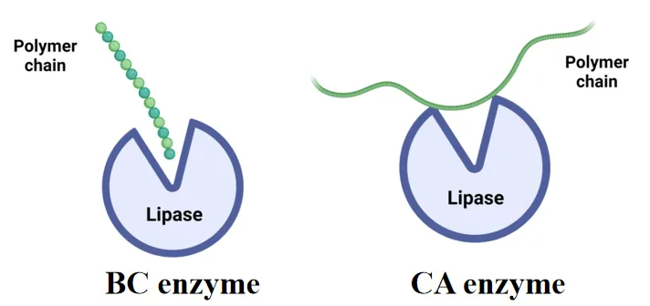塑料降解的第一步,是需要将活体塑料内部的孢子成功释放并重新复苏生长。研究人员第一时间尝试了两种孢子释放的方式。一种方法是利用南极假丝酵母脂肪酶B(Lipase CA)对塑料表面进行侵蚀。Lipase CA对PCL塑料的水解作用是一种“剪刀”形式(图3),在宏观上表现为对PCL塑料的外部破碎作用。