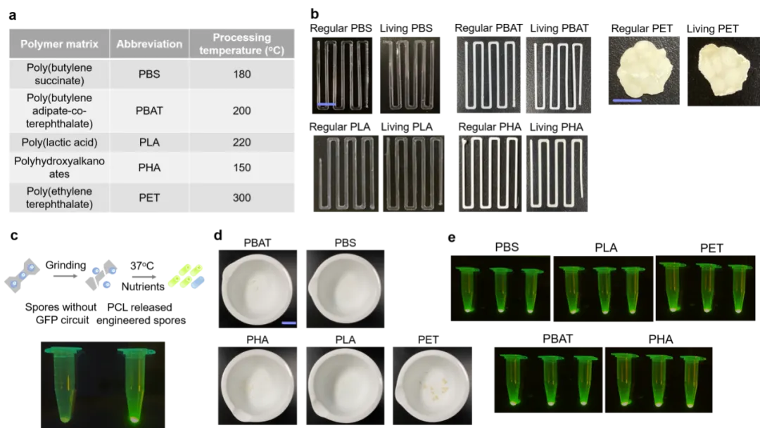 研究团队将工程化改造的孢子溶液与PCL塑料母粒直接混合,顺利获得高温熔融挤出或者有机溶剂方法制备了一系列含有孢子的塑料。在物理性能方面的各项测试中,研究团队发现活塑料与PCL普通塑料,在屈服强度、应力极限、最大形变量和熔点等参数上均没有显著区别。日常使用环境中,孢子保持休眠状态,塑料也可保持稳定的使用性能(图2)。