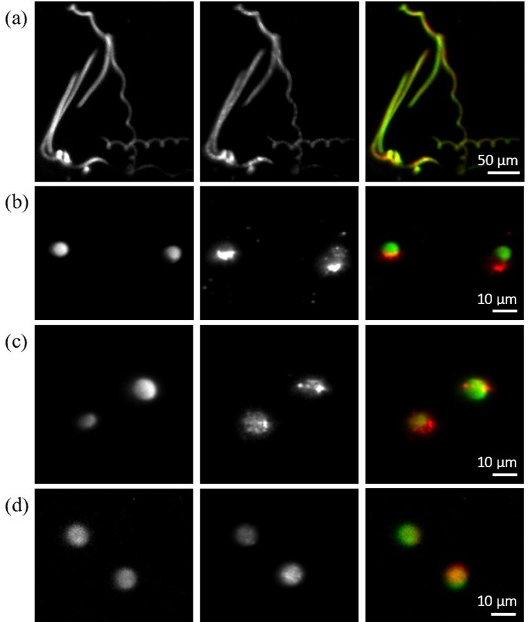 (a)、(b)和(c)分别展示了螺旋藻(Spirulina platensis)、杜氏盐藻(Dunaliella salina)和莱茵衣藻(Chlamydomonas reinhardtii),(d)则显示了一种未知藻的成像效果。每行从左到右依次为叶绿素a荧光图像、散射图像以及合成伪彩色复合图像。