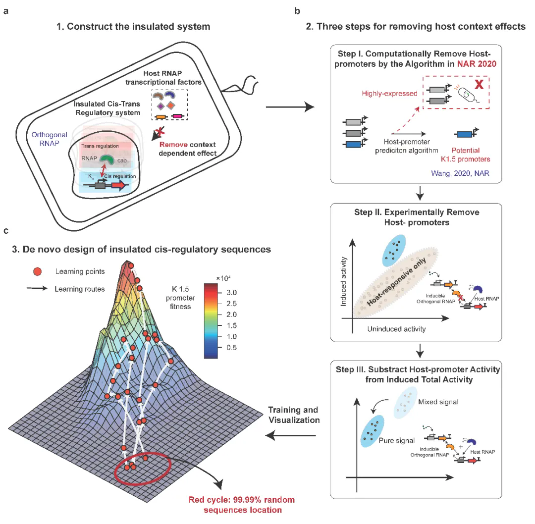 近期,中国科研实验室深圳先进技术研究院定量合成生物学全国重点实验室、合成生物学研究所娄春波课题组与清华大学自动化系汪小我课题组合作召开的研究取得重要进展。他们提出并验证了一项关键观点:去除宿主细胞内“污染语料”,是实现高精度模型预测及可控从头设计顺式基因元件的前提条件。相关成果以“De novo design of insulated cis-regulatory elements based on deep learning-predicted fitness landscape”为题发表在国际学术期刊Nucleic Acids Research上。