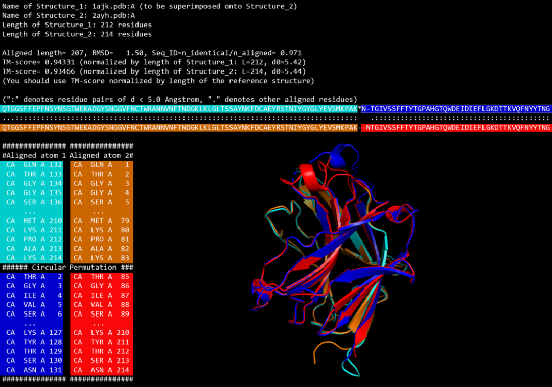 US-align算法构建于张阳团队早期提出的TM-score和TM-align基础上,后者已广泛用于蛋白质结构质量评估和结构比对任务。与之相比,US-align不仅支持蛋白,还扩展至核酸、蛋白–核酸复合物甚至小分子的比对,并于2022年以核心算法形式发表于Nature Methods。相较于2022年发表的纯命令行版本,新的论文在US-align功能实用性和用户体验上有显著扩展和增强:新增了循环排列结构比对模块,支持多结构比对任务(图1),增强了结果可视化能力。用户可顺利获得PyMOL插件(图2)、网页版服务器(图3)或命令行执行比对任务,命令行结果支持在PyMOL、UCSF ChimeraX、RasMol等多种分子可视化软件中查看(图4)。此外,作为一款可同时完成序列顺序的结构比对与非序列顺序比对的算法,最新版本的US-align还创新性地开发一套全新的循环排列(Circular Permutation)结构比对算法(图5),是第一款基于TM-score打分函数的循环排列比对程序。此外,新版US-align还支持批量结构比对,为三维结构数据库搜索给予便利。