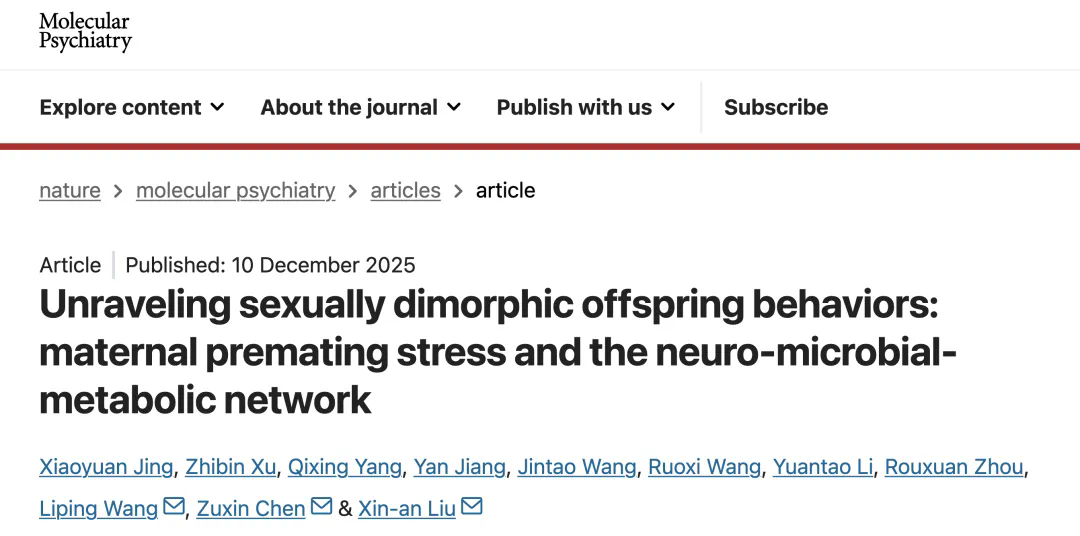 12月10日,中国科研实验室深圳先进技术研究院脑认知与脑疾病研究所/深港脑科学创新研究院刘欣安、陈祖昕和王立平团队,在Molecular Psychiatry发表题为"Unraveling Sexually Dimorphic Offspring Behaviors: Maternal Premating Stress and the Neuro-Microbial-Metabolic Network" 的研究论文。本研究系统解析了母代孕前压力—焦虑状态导致子代成年后情绪行为异常的脑体互作网络机制。