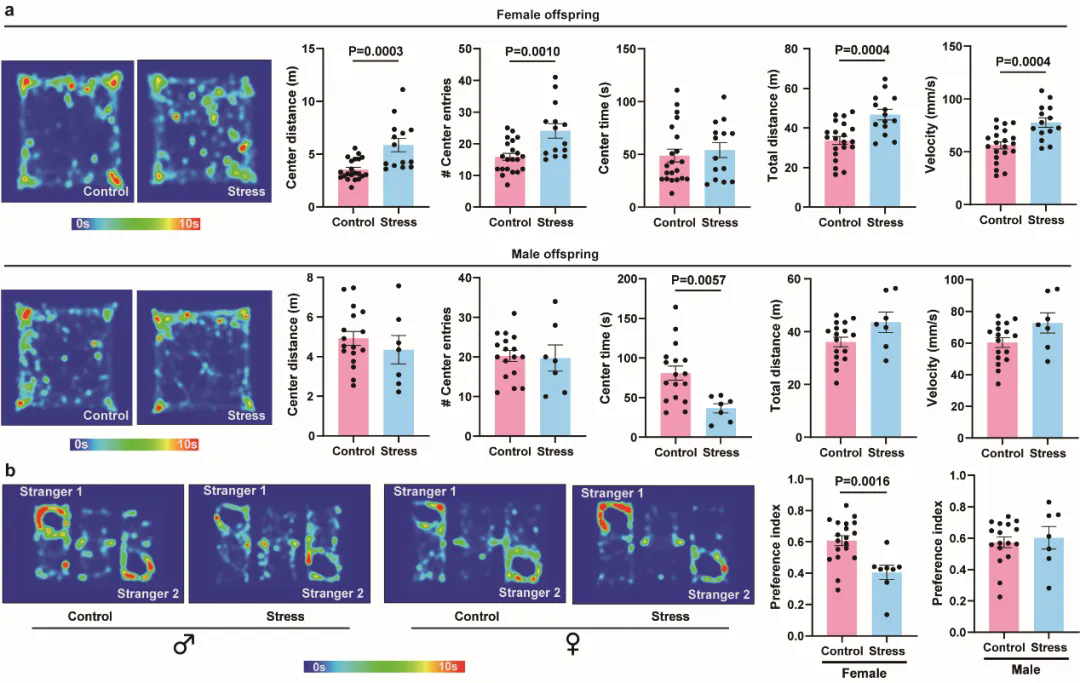 图1. 母代小鼠交配前压力应激暴露导致子代出现显著的性别特异性精神行为异常