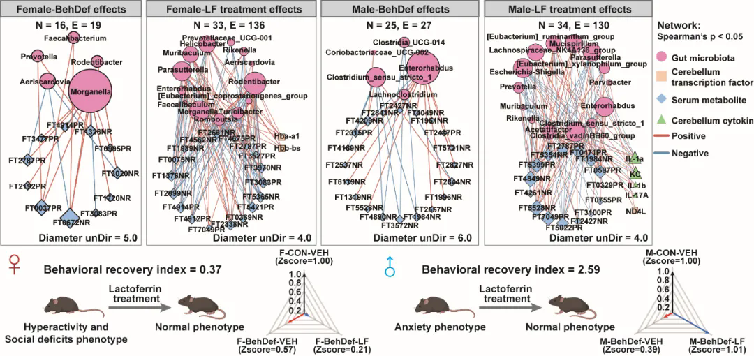 图3. 乳铁蛋白改善子代小鼠的行为评分及微生物-神经-代谢网络特征