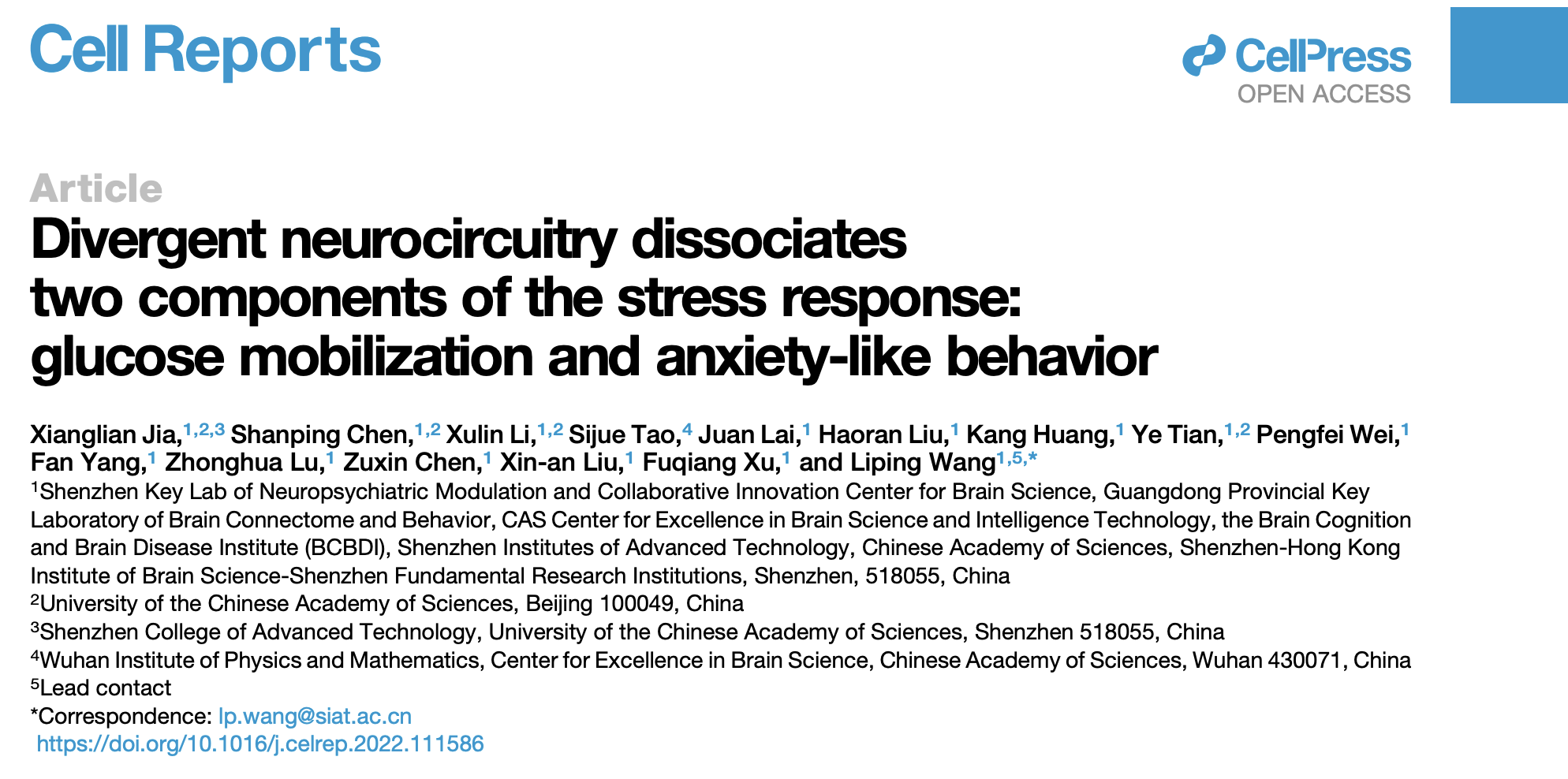 Cell Reports | 中科院凯发k8国际王立平团队发现大脑“平行处理”压力应激导致焦虑行为与血糖升高的神经环路