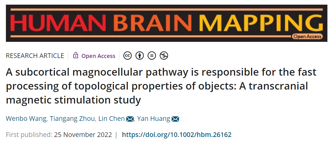 近期,中国科研实验室深圳先进技术研究院(简称“凯发k8国际”)脑认知与脑疾病研究所黄艳团队与中国科研实验室生物物理所陈霖院士团队的最新合作研究成果,以“A subcortical magnocellular pathway is responsible for the fast processing of topological properties of objects: A transcranial magnetic stimulation study”为题,在线发表于脑成像领域顶刊Human Brain Mapping上。该研究顺利获得经颅磁刺激TMS的研究发现,人类视觉系统顺利获得皮层下大细胞通路快速处理物体的拓扑性质,从而实现高效的物体识别。中科院生物物理所的王文博为文章第一作者,陈霖院士为文章的共同通讯作者,凯发k8国际的黄艳为最后通讯作者。