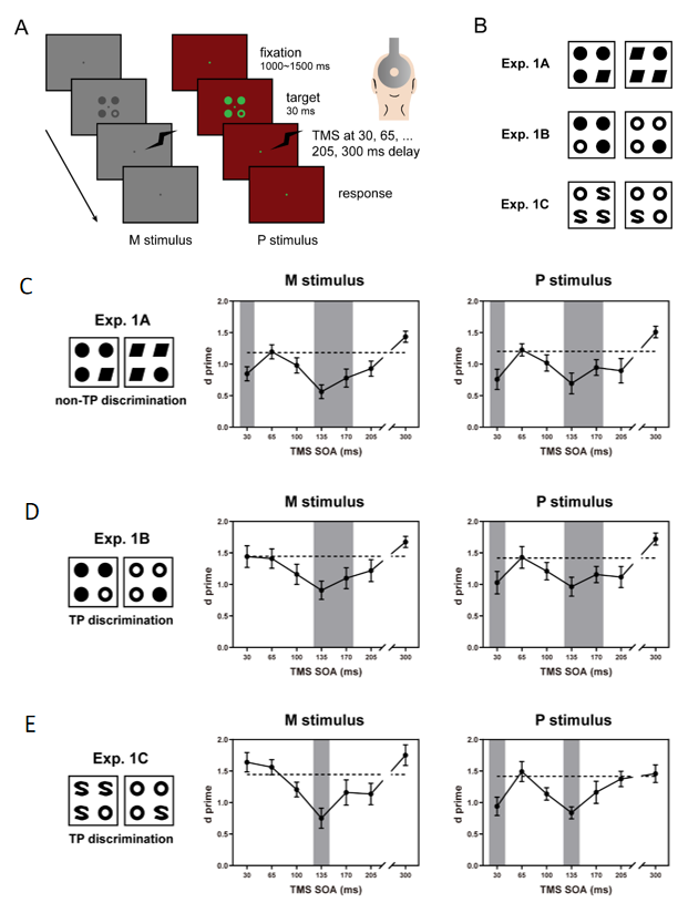 研究人员采用单脉冲经颅磁刺激TMS,在刺激出现后的不同时间点作用于初级视觉皮层V1,以暂时阻断视觉信息在皮层的加工。同时结合大细胞通路和小细胞通路的加工特性,设计了偏向大细胞通路加工的M刺激(低对比度灰度图像)以及偏向小细胞通路加工的P刺激(主观等亮度红/绿图形),见图1。研究发现,在视觉加工初期(30 ms)以及晚期(135-170 ms),TMS对V1的阻断都会明显干扰形状等非拓扑性质的识别(图1C);然而,在视觉过程初期TMS对V1的阻断没有对M刺激的拓扑性质的加工造成干扰(图1B, C)。这提示,拓扑性质的初期加工独立于皮层,发生在皮层下的大细胞通路。