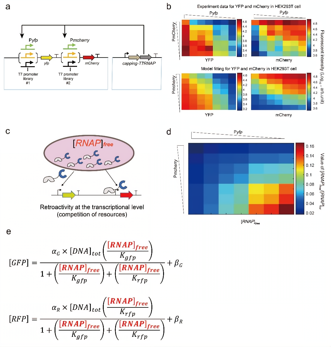 本论文发现了不同基因表达活性的竞争效应,并建立了定量的热力学模型。针对两个基因的竞争问题,研究团队设计了一个哺乳动物细胞系中的两个报告基因(图2)。在这个双报告基因体系中,每个报告基因由正交型启动子库中的七个代表性启动子之一控制,共有49种不同的组合。实验结果发现一个基因的强启动子显著降低了另一个基因的表达。这个结果证明了两个报告基因在竞争有限资源( [RNAP]free)。因此,本论文提出了利用[RNAP]free取代的[RNAP]tot的新型热力学方程式(图2e)。