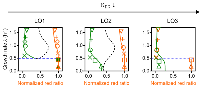 [2] 在不同培养条件下,细胞的稳态状态与数量将发生变化,当细胞生长速率低于0.5h-1时,细胞只存在红色一个稳定状态。