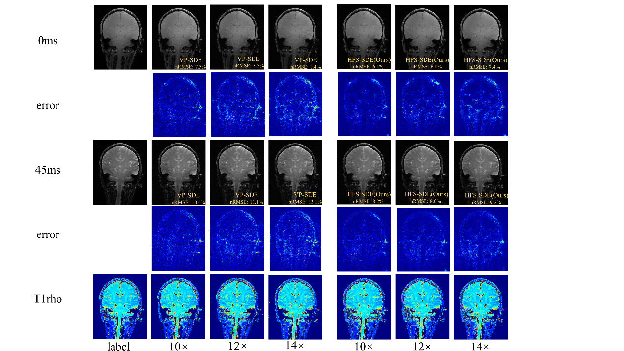 团队提出的HFS-SDE方法不仅提高了扩散模型的稳定性,并在5T时实现了T1ρ定量成像的高加速,而且更准确地恢复MR图像中的高频细节。