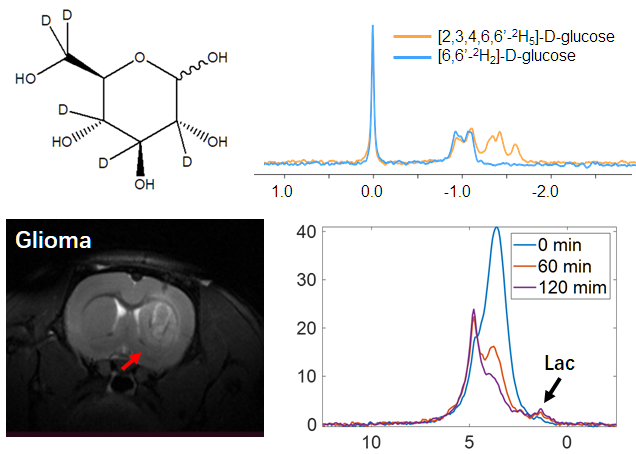 无创反映活体内细胞分子代谢特征对于分析肿瘤和神经退行性疾病等重大疾病的发病机制、制定疾病治疗方案和监测疾病进展至关重要。现在,能用于人体临床的分子代谢成像主要依赖于正电子发射型计算机断层显像技术(PET)或磁共振波谱技术(MRS)。磁共振氘(deuterium,D)代谢成像(DMI)技术是近年来兴起的一种分子代谢成像手段,机体摄入氘标记的探针后,顺利获得磁共振波谱成像技术检测氘标记探针以及它们的下游代谢产物,实现代谢流的定量检测。与PET技术相比,它不仅能够反映机体对探针的摄取,还能给予了更多代谢下游的细节,无电离辐射且易于实施。然而,氘标记探针价格昂贵,人体扫描使用量费用高达数千甚至上万元,昂贵的价格是该技术临床应用的障碍之一。近期,团队成员联合研制了新的氘标记化合物[2,3,4,6,6'-2H5]-葡萄糖,合成成本显著低于现有商用[6,6'-2H2]-葡萄糖,团队还在超高场下证明了这种新化合物可以反映大鼠胶质瘤模型的糖酵解通量,这些工作将有力的有助于超高场磁共振氘代谢成像的临床应用。该成果“A new deuterium-labeled compound [2,3,4,6,6’-2H5]-D-glucose for deuterium magnetic resonance metabolic imaging”发表于磁共振分子代谢成像领域重要期刊NMR in Biomedicine上,并选为当期封面文章。