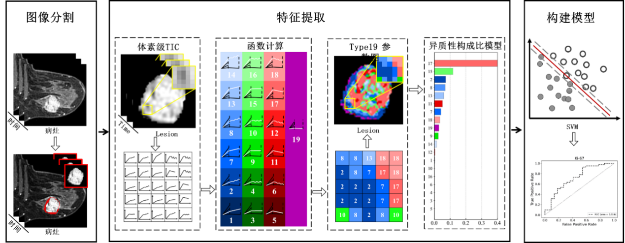 研究团队从2018年12月至2022年7月,回顾性纳入了259名接受乳腺动态增强磁共振成像(DCE-MRI)检查的患者,共325个病理学证实的乳腺病变。基于手动分割的乳腺病变,将整个3D病变内每个体素的时间-信号曲线根据初始强化速率(未强化、缓慢、中等和快速)、延迟强化状态(持续、平台和下降)和强化稳定性(稳定和不稳定)分为19类,并计算每个病变的这19类TIC曲线的组成比作为新的特征集(定义为type-19)。分别用type-19特征、临床常用的三型TIC(流入型、平台型和流出型)以及半定量参数构建机器学习模型,用于鉴别病变的良恶性、病理分级、增殖状态(Ki-67)和分子亚型(详见技术路线图1)。