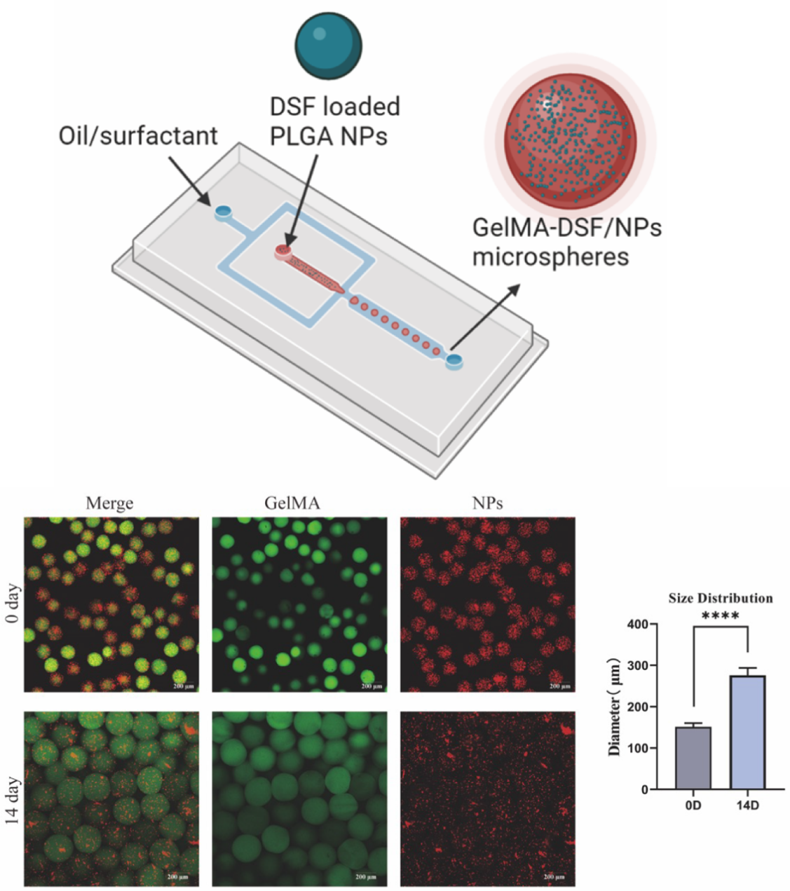 研究团队进一步开发了一种双层包封方法, 将DSF封装于聚乳酸-乙醇酸共聚物的纳米颗粒中,并顺利获得微流控的方法进一步将纳米颗粒包封在明胶甲基丙烯酸酯微凝胶中(图2)。体外及活体成像研究结果表明,微凝胶双层封装的方式减少了DSF在前期的药物突释, 延长了DSF的治疗窗口,双层包封的方法也提高了其在关节病灶内的停留时间,优化了DSF的药代动力学表现(图3)。