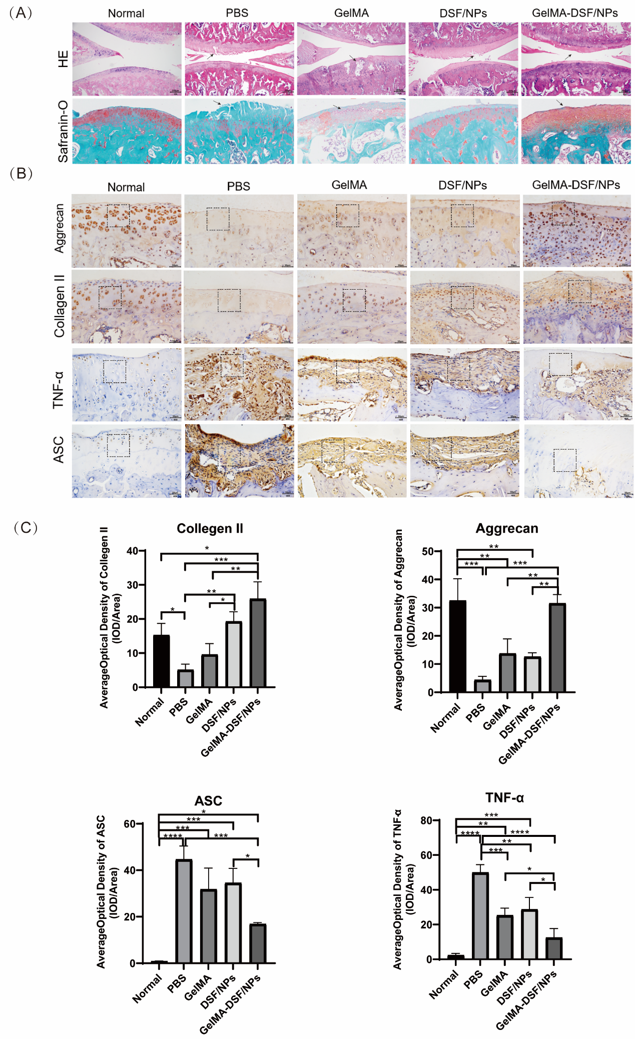最后,在以碘乙酸盐诱导的大鼠骨关节炎模型中,研究者发现DSF从微凝胶中持续释放,减轻了软骨炎症和软骨下骨侵蚀,并能促进软骨组织再生修复(图4)。