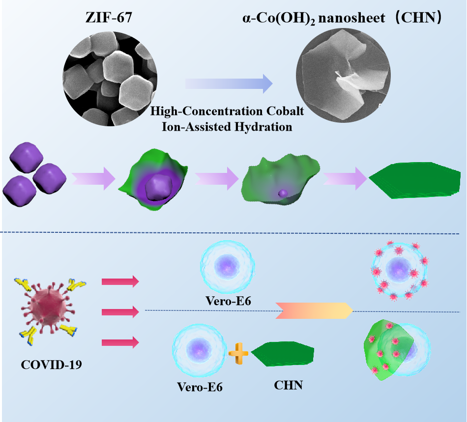 基于上述背景,研究团队开发了一种名为高浓度钴离子辅助水合反应(HCCAH)的新合成策略,利用沸石咪唑框架ZIF-67作为前驱体,成功合成了独立、平整且超薄的 -Co(OH)2 (CHN)纳米片。这些纳米片具有丰富的与新冠病毒Spike蛋白(S蛋白)RBD结合的接触位点,可以有效抑制新冠病毒感染宿主细胞。