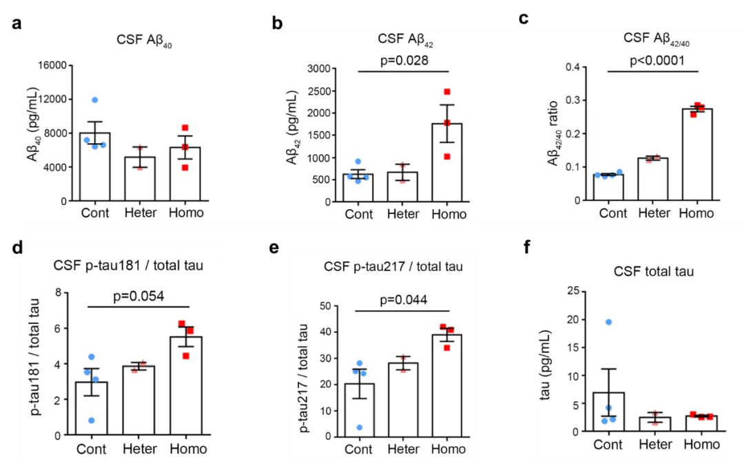 图1. PSEN1突变猴脑脊液中AD相关生物标志物的变化