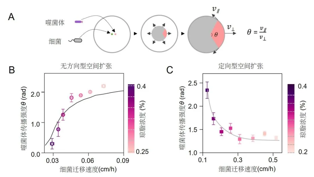 图 1 (A)细菌-噬菌体空间上的共传播形成一个扇形感染区。(B)无方向型空间扩张和(C)定向型空间扩张下细菌的运动性和病毒传播的关系