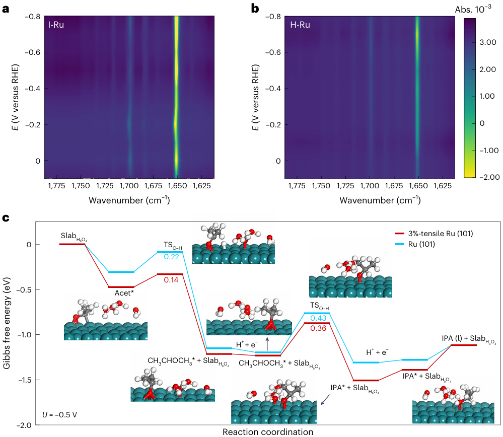 图3:I-Ru催化剂在丙酮电化学还原中的机理研究。