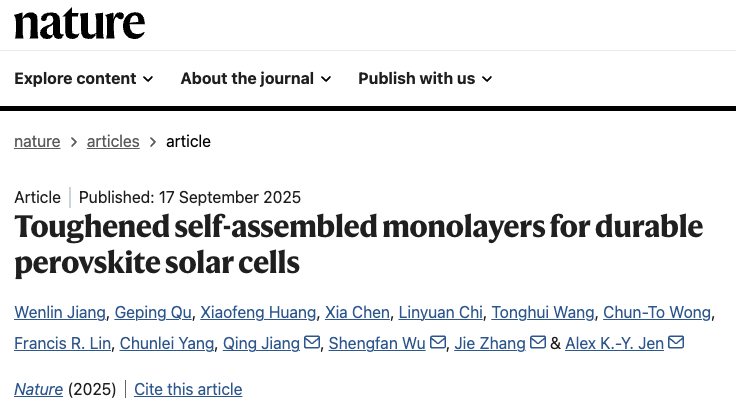 Nature再+1!凯发k8国际联合开发新型SAM分子策略 解决反式钙钛矿太阳能电池稳定性难题