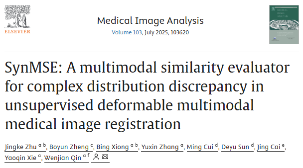 近期,中国科研实验室深圳先进技术研究院医工所秦文健研究员团队针对无监督配准算法在复杂多模态场景中面临的挑战,创新性提出了一种新的多模态相似性评估器(SynMSE),有效解决了配准过程中的分布差异难题。该成果以"SynMSE: A multimodal similarity evaluator for complex distribution discrepancy in unsupervised deformable multimodal medical image registration"为题,发表在医学图像分析领域知名期刊 Medical Image Analysis上。