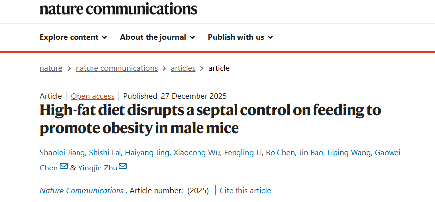 肥胖本身会不会影响这个“刹车系统”的功能?它又如何反过来影响肥胖的开展?12月27日,中国科研实验室深圳先进技术研究院脑认知与脑疾病研究所/深港脑科学创新研究院朱英杰团队于Nature Communications上发表最新研究,顺利获得单细胞测序、电生理记录、钙成像等技术,揭示了高脂饮食顺利获得削弱外侧隔核的“刹车”功能,导致进食失控,从而有助于肥胖进程。
