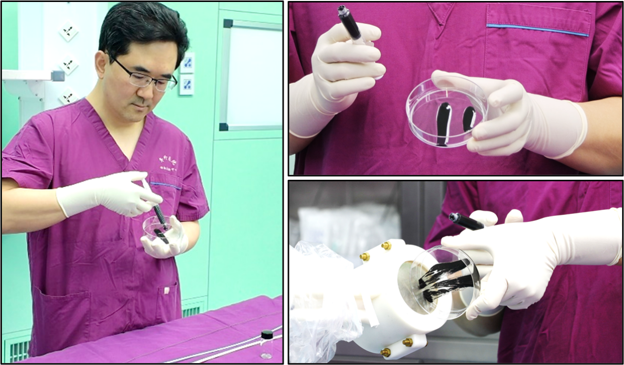 团队在离体猪上完成初步验证后,对初版磁流体的磁性、流动性、固定性等方面进行了改进和优化,最终研发出了一款新型磁流体机器人。该机器人可以经心脏介入导管进入左心耳中,在磁力牵引下,能成功对抗高速血流和剧烈心跳带来的干扰。与血液接触后,它能快速原位固化,继而形成完全贴合左心耳形状的磁凝胶,对出血部位完全封堵。