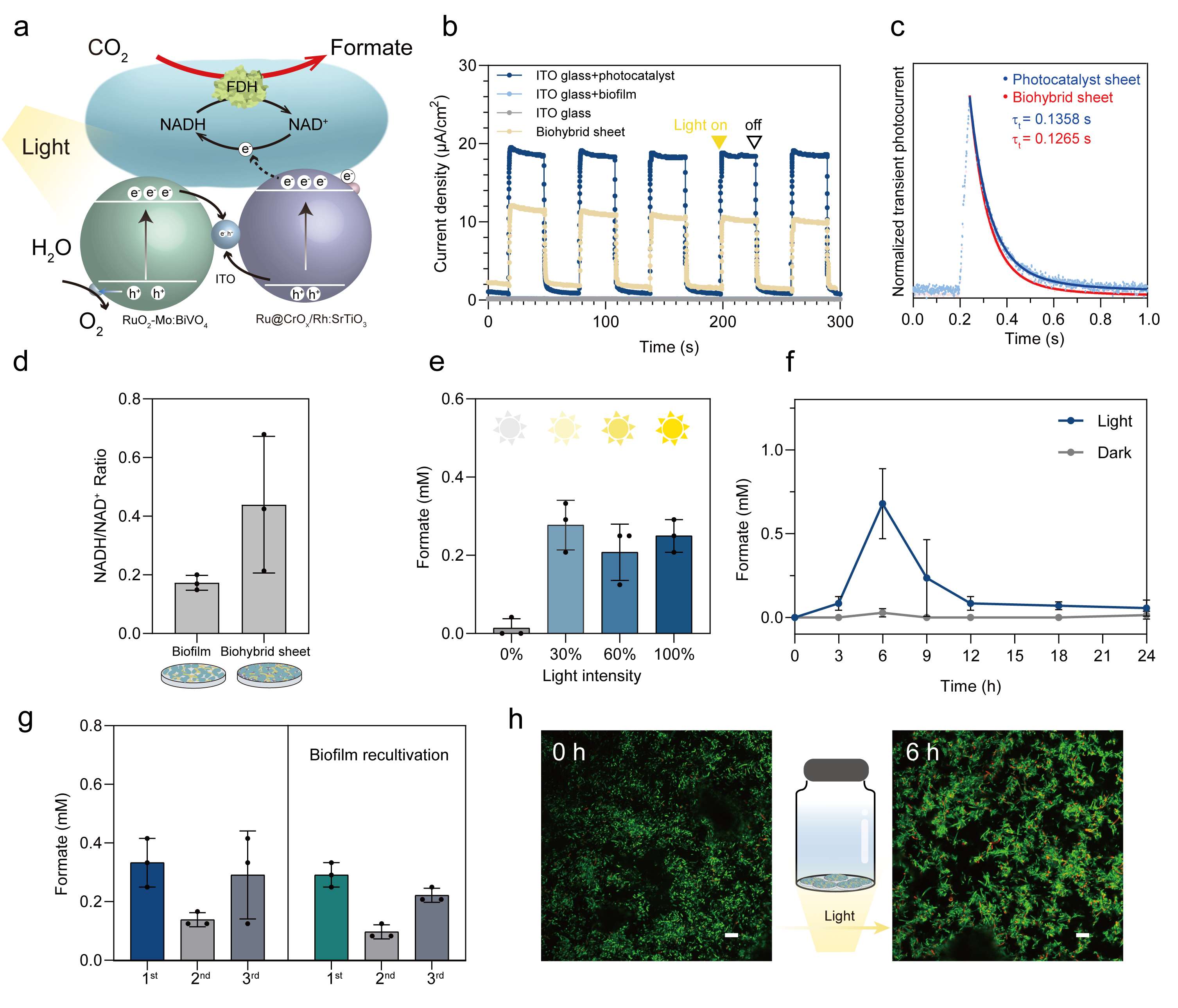 进一步,团队改造大肠杆菌生物被膜实现双功能:其一,顺利获得共形贴附使生物被膜在光催化剂表面形成均匀致密涂层;其二,在胞内表达甲酸脱氢酶(FDH)赋予CO₂固定能力,利用光生电子驱动CO₂还原生成甲酸。由此构建的光催化剂-生物被膜复合体系,模拟了天然光合作用的光能转化路径——光生电子高效传递至工程菌细胞内驱动甲酸合成,空穴则被水氧化消耗,形成无牺牲剂的完整光驱动反应循环。电化学测试表明,该杂化体系光照下瞬态光电流显著优于对照体系;电荷动力学分析显示,生物膜引入后电子传输时间缩短,细胞内NADH/NAD⁺水平提升2.5倍,验证了光电子成功参与代谢反应。