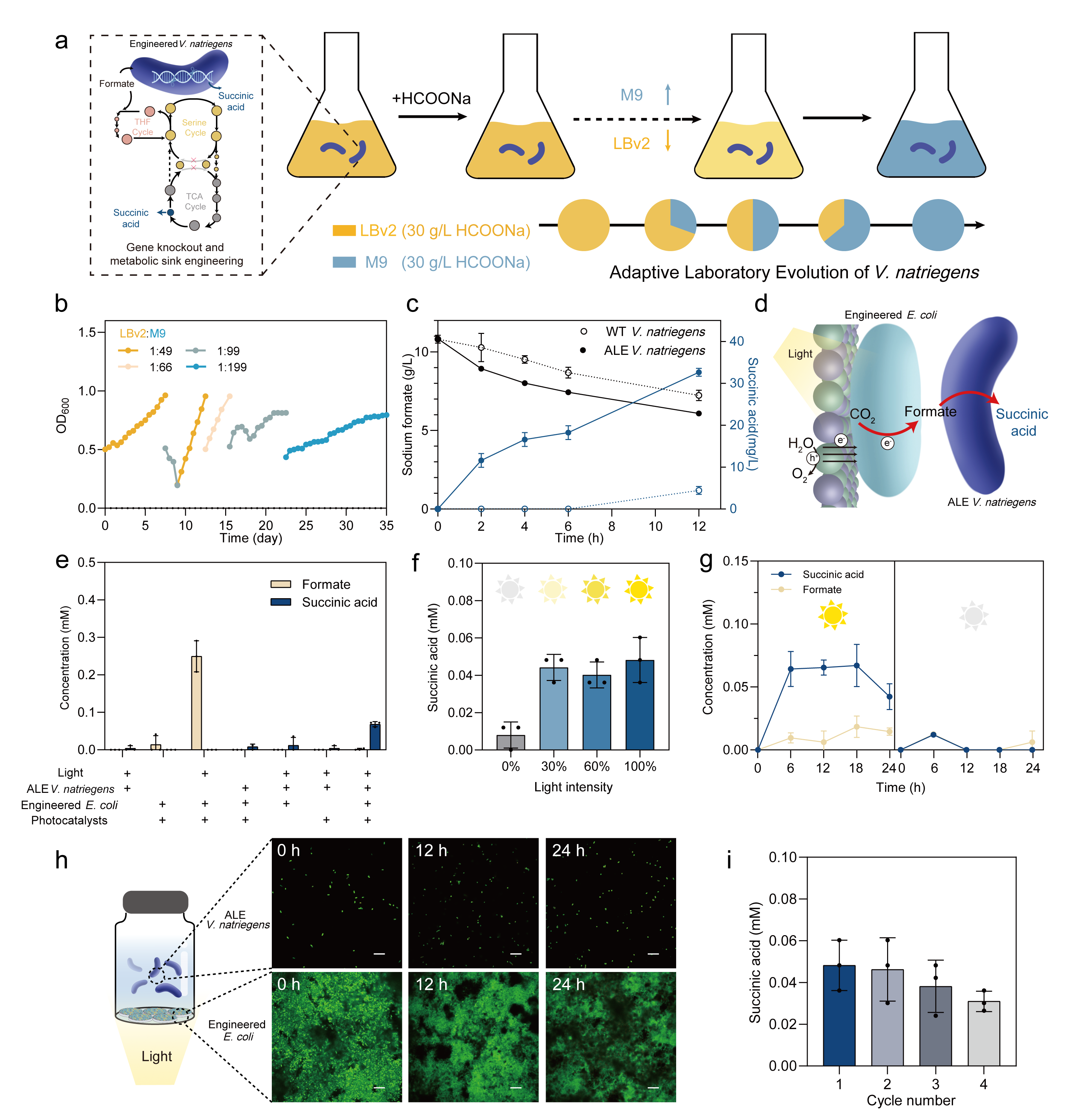 为模拟天然光合作用的长链合成能力,实现碳链延长,研究团队构建了人工微生物群落:选择需钠弧菌(Vibrio natriegens)作为底盘,顺利获得基因敲除耦联丝氨酸循环与三羧酸循环,强化甲酸耐受能力;经5轮适应性实验室进化(adaptive laboratory evolution,ALE)后,顺利获得四氢叶酸(THF)循环增强甲酸同化能力,使该菌株最终取得利用甲酸盐合成丁二酸的能力。适应性进化的需钠弧菌消耗甲酸的速度更快,12小时内产生了浓度为33 mg/L的琥珀酸,而野生型菌株则无法实现。