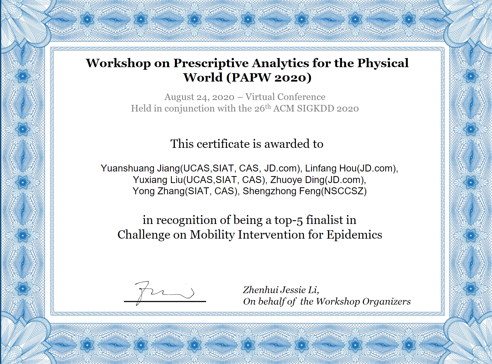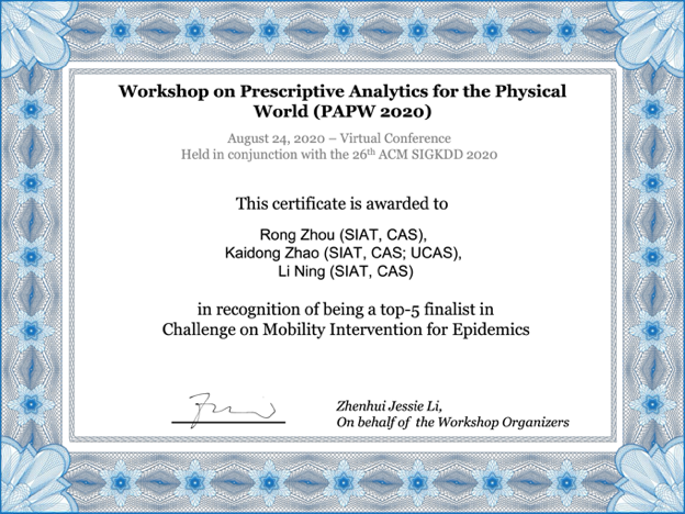 8月23日到27日,数据挖掘、知识发现领域的国际最高级别学术会议—— KDD 2020 在线上举办,会上颁发了由PAPW 2020(The Workshop of Prescriptive Analytics for the Physical World) 组织的“流行病流动干预竞赛”相关奖项。来自中国科研实验室深圳先进技术研究院高性能计算技术研究中心的两支参赛队伍包揽了比赛的冠亚军,参赛队伍的指导教师为宁立副研究员。